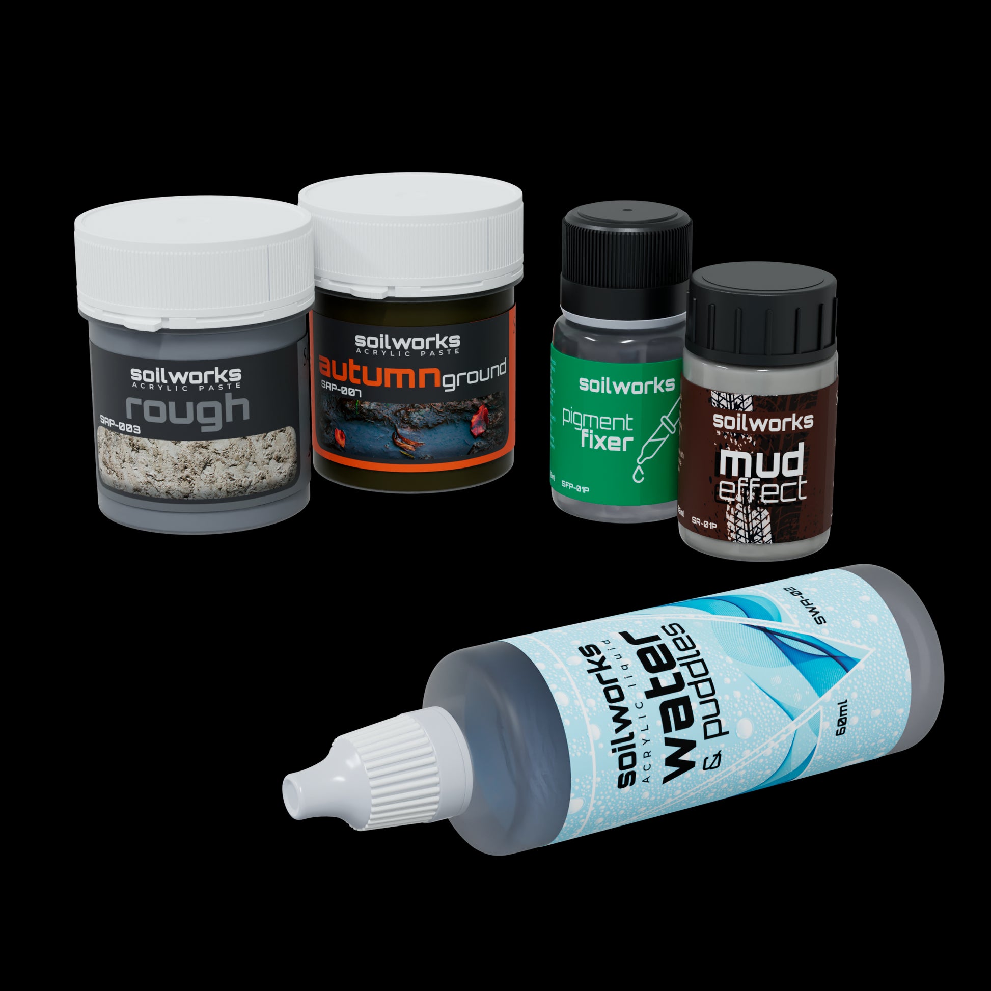 A themed set designed to help you create humid, autumnal environments and scenarios. With this selection of materials and paints, you can create large and small scenes for your miniatures, figures, or vehicles, providing you with the necessary products to carry them out. A must-have set for all modelers!