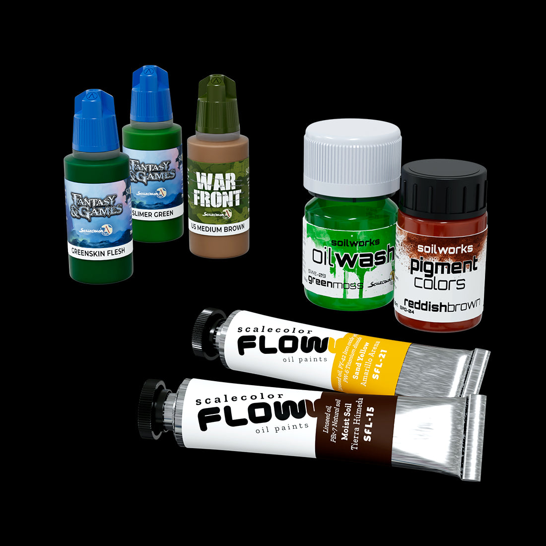 A themed set designed to help you create different jungle and tropical environments. With this selection of materials and paints, you can create scenes for your miniatures, figures, or vehicles, providing you with the necessary products to carry them out. A must-have set for all modelers!