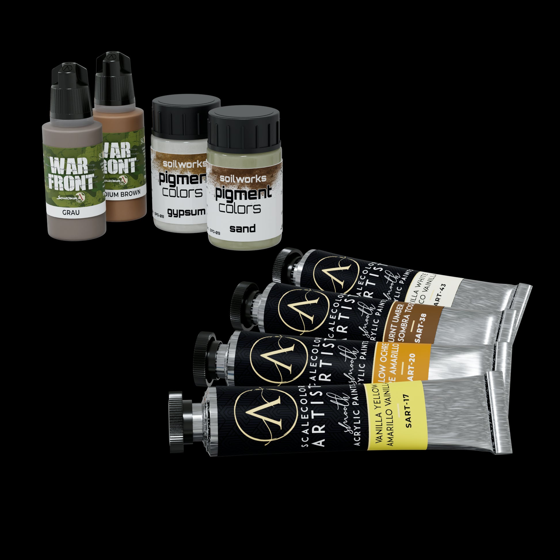 A themed set designed to help you create dry, summery climates and settings. With this selection of materials and paints, you can create large and small scenes for your miniatures, figures, or vehicles, providing you with the necessary products to carry them out. A must-have set for all modelers!