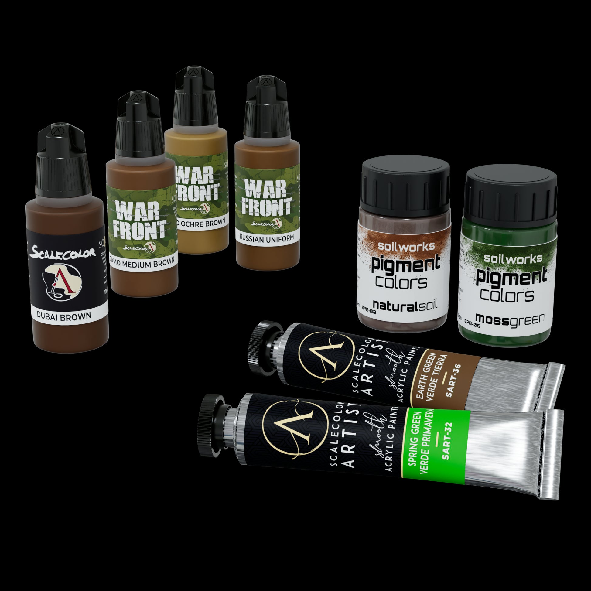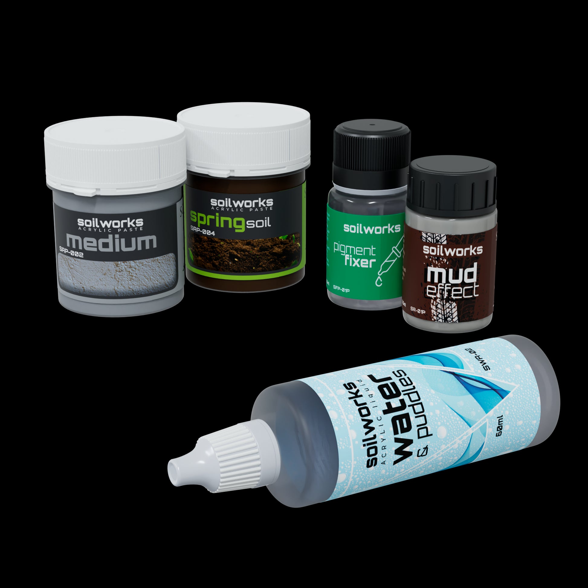 A themed set designed to help you create spring-like environments and scenarios. With this selection of materials and paints, you can create large and small scenes for your miniatures, figures, or vehicles, providing you with the necessary products to carry them out. A must-have set for any modeler!