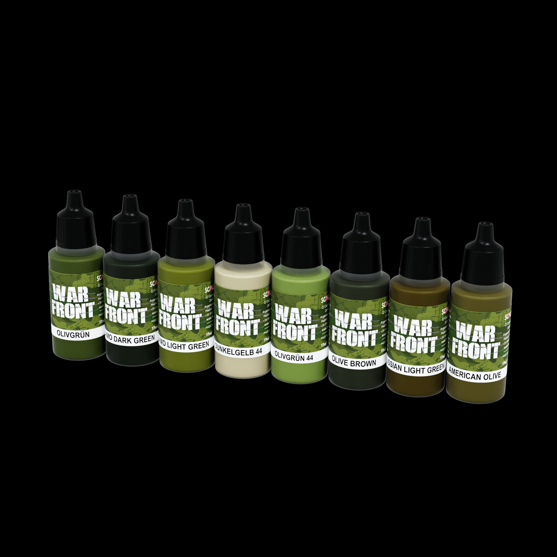 Set of 8 acrylic colors for painting military uniforms in different shades of green, used from the 20th century to the present day. Includes Allied and Warsaw Pact uniform greens, muted greens, khaki greens, and typical wear shades found in field garments, webbing, backpacks, and helmets. Perfect for historical military figures and wargames.