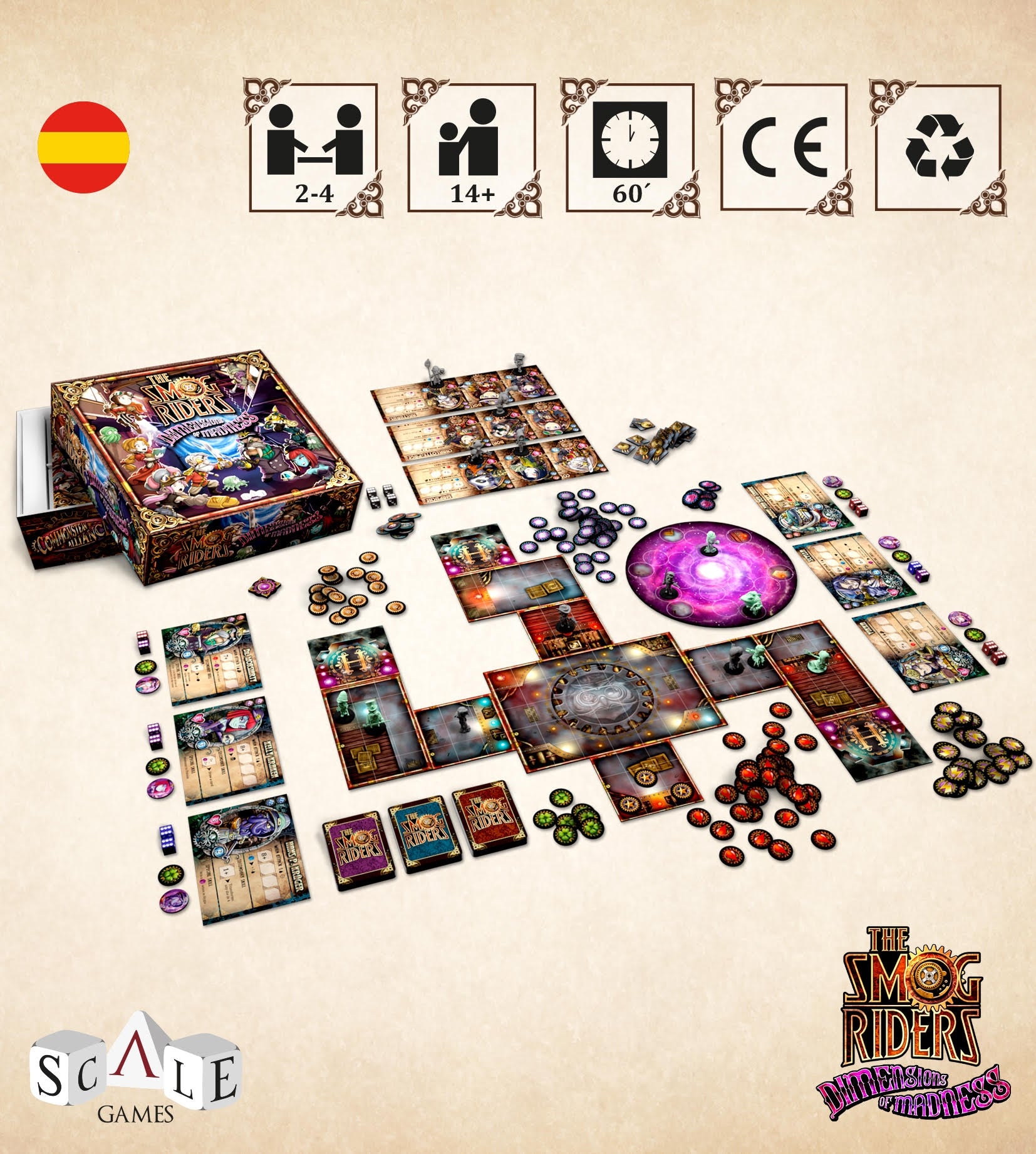 The Smog Riders - Dimensions of Madness is a game for 2 to 4 players, where each player controls a group of unique characters who compete against each other for control of steam technology and the secrets hidden in the Stygian Dimension.
