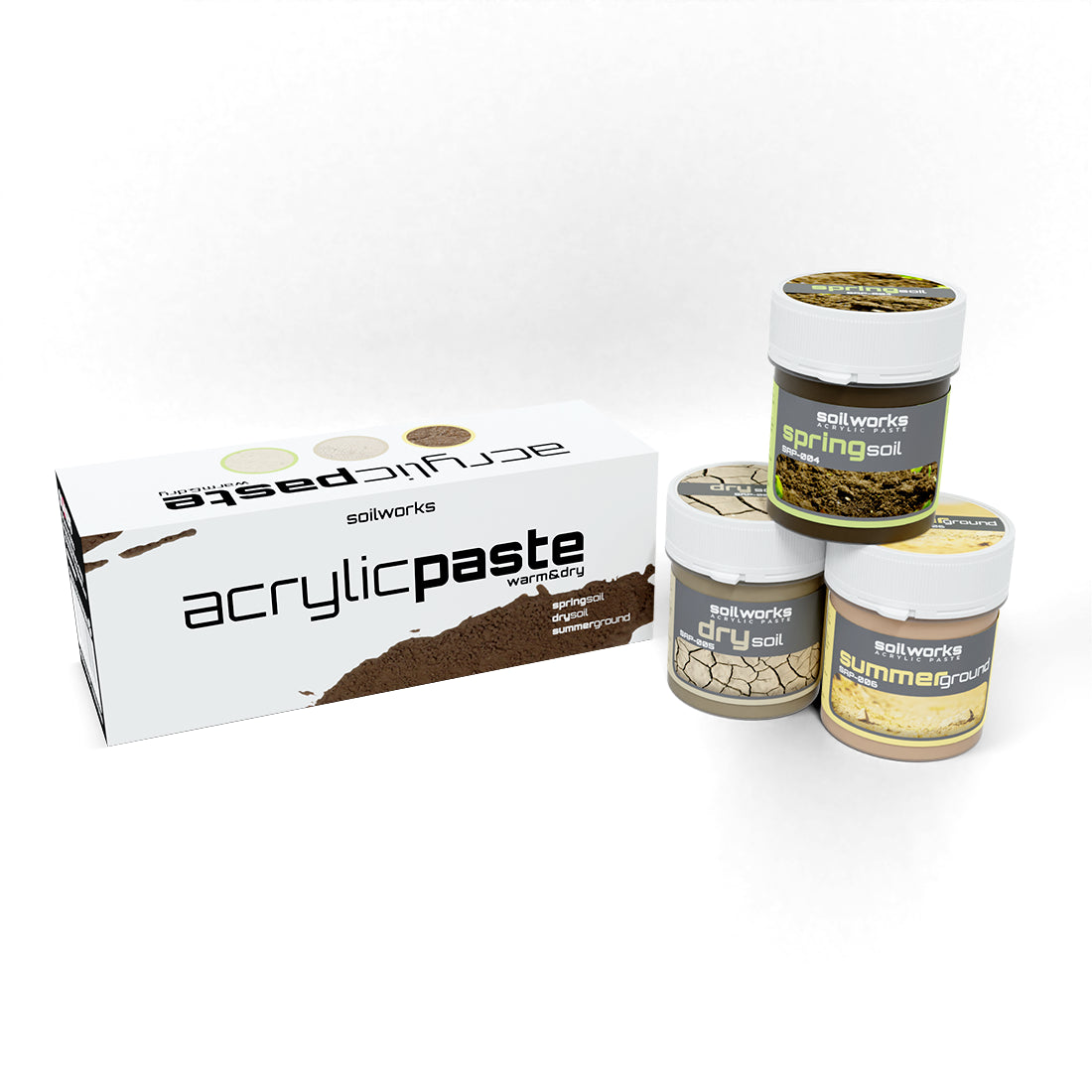 Dense-looking acrylic texture developed for creating scenes, vignettes, or game bases, providing highly realistic floors and terrain. The pastes allow you to add volume, texture, incorporate elements such as stones and sand, and color the surface to your liking. Once dry, the texture can be sanded and any type of paint applied. It can also be diluted with water to achieve different effects. It is easy to apply, either with a brush or a spatula, and the tools used can be easily cleaned with water.