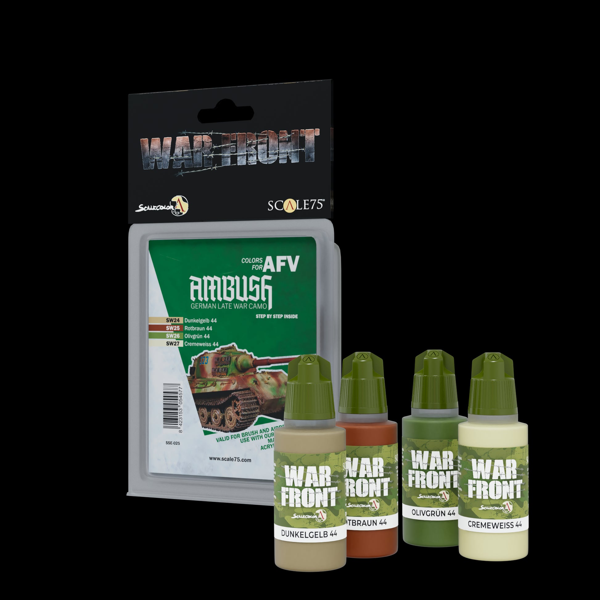 Ambush. Set de 4 pinturas acrílicas acabado mate, con los colores básicos utilizados por los vehículos militares alemanes durante la batalla de las Ardenas y el final de la guerra en 1945. Estas pinturas tienen una gran resistencia y soportan sin problema cualquier técnica de envejecimiento realizada con óleo, pigmentos y lavados enamel. Antes de usar perforar el obturador del bote de pintura. Te recomendamos que introduzcas en el bote una bolita o agitador para facilitar la mezcla de la pintura. Usando una buena dilucion con el thinner acrilico podrás aerografiar perfectamente. Preferible usar boquillas en aerógrafo de 0,4 o diametro superior para un buen rendimiento de la pintura.