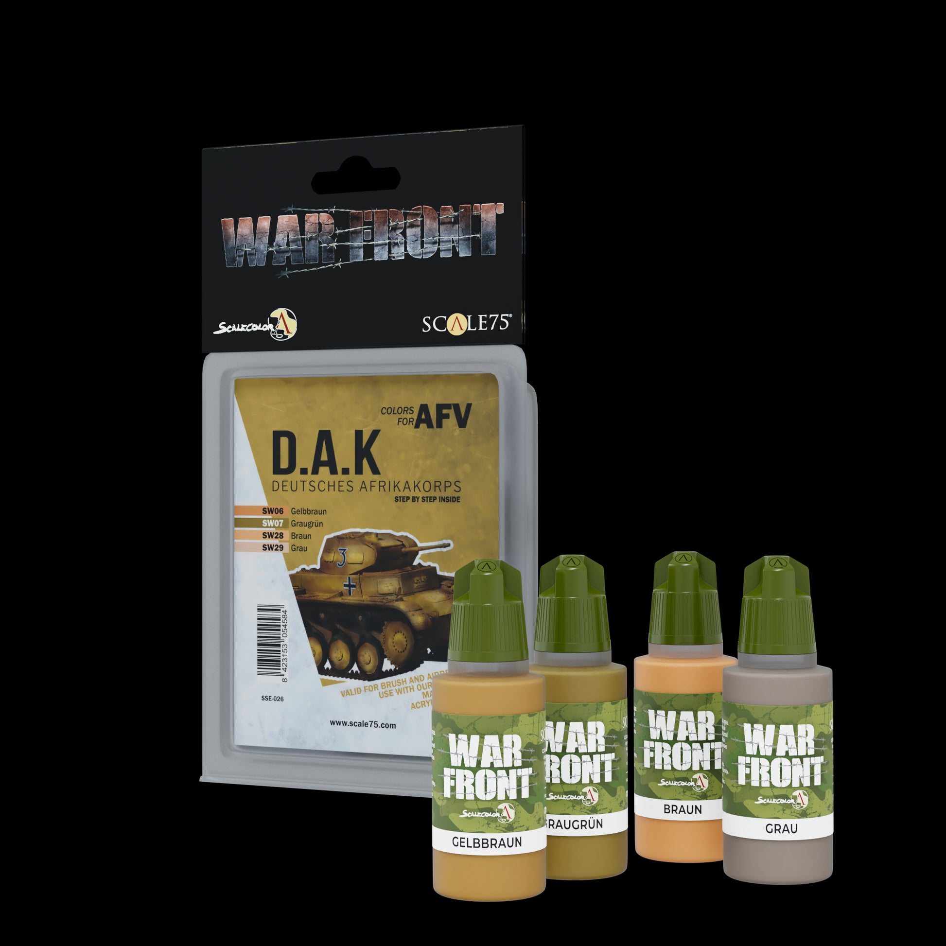 DAK colors for AFV. Set de 4 pinturas acrílicas acabado mate, con colores apropiados para pintar vehículos usados por el ejército alemán en la campaña del norte de África. Este set se puede complementar con el SSE 039 Blitz 1939-1942. Estas pinturas tienen una gran resistencia y soportan sin problema cualquier técnica de envejecimiento realizada con óleo, pigmentos y lavados enamel. Antes de usar perforar el obturador del bote de pintura. Te recomendamos que introduzcas en el bote una bolita o agitador para facilitar la mezcla de la pintura. Usando una buena dilucion con el thinner acrilico podrás aerografiar perfectamente. Preferible usar boquillas en aerógrafo de 0,4 o diametro superior para un buen rendimiento de la pintura.
